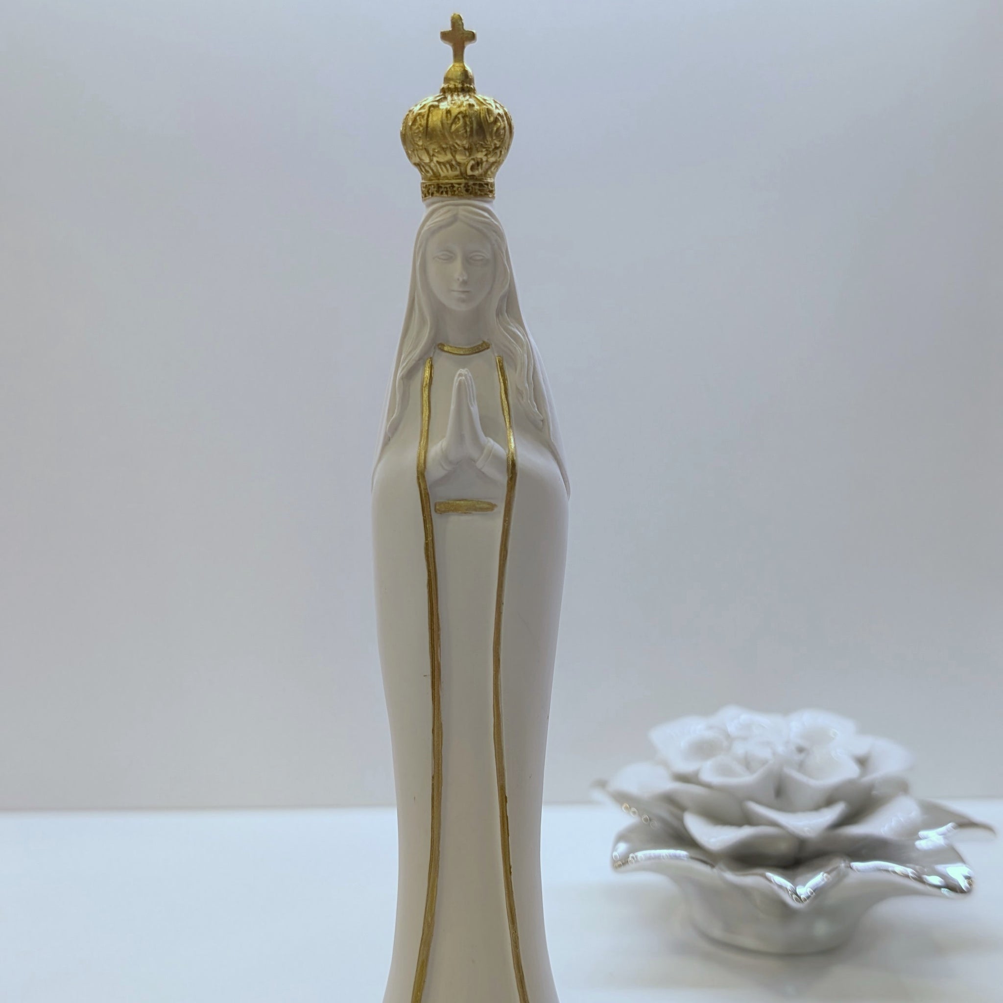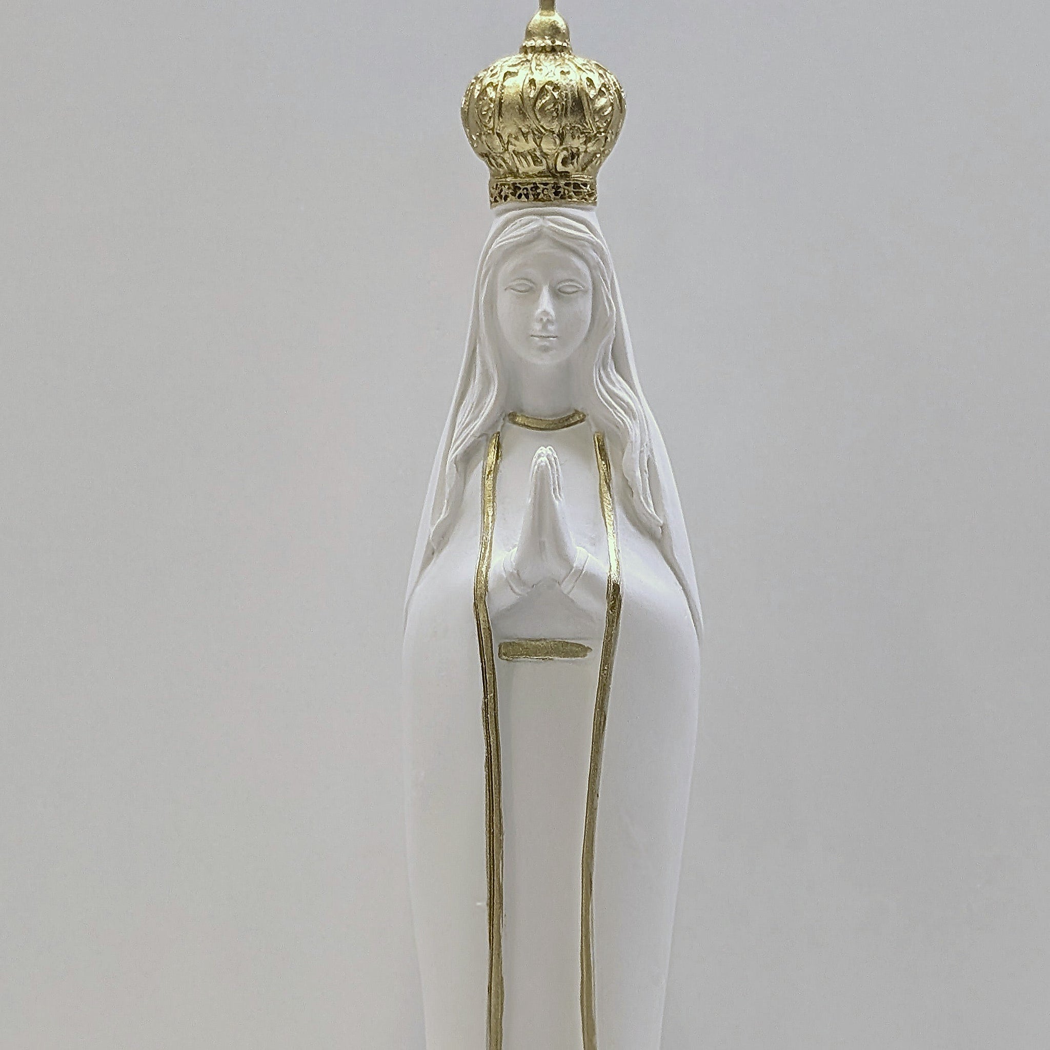 This Golden Our Lady of Fatima Imagem offers a radiant and contemporary tribute to the Virgin Mary. Standing at 20 cm (approximately 7.9 inches) tall, this resin statue is characterized by its elegant golden finish and serene, hand-painted facial features. The design balances a modern, minimalist aesthetic with traditional lines inspired by the original 20th-century sculptures of the Fatima Sanctuary. Whether placed in a modern living space or a traditional prayer corner, this piece serves as a luminous reminder of the grace and peace brought by the Apparitions.